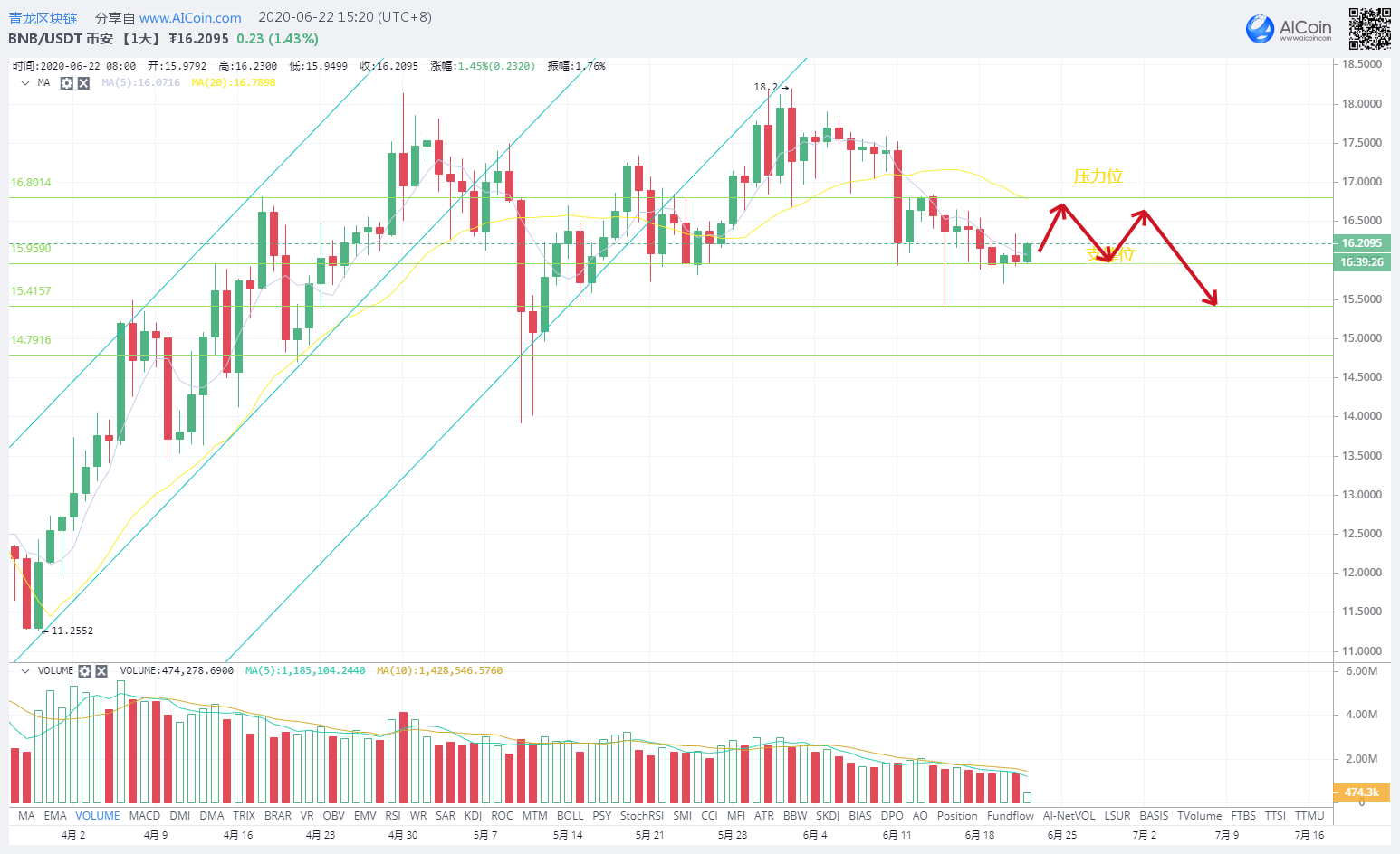 BNB,24H指标分析16.8U也就是20日均线位置,5日均线和20日均线的方向均向下,若上行不过16.8U就会继续试探15.9U的支撑位,支撑位15.9U/15.0U,压力位16.8U.