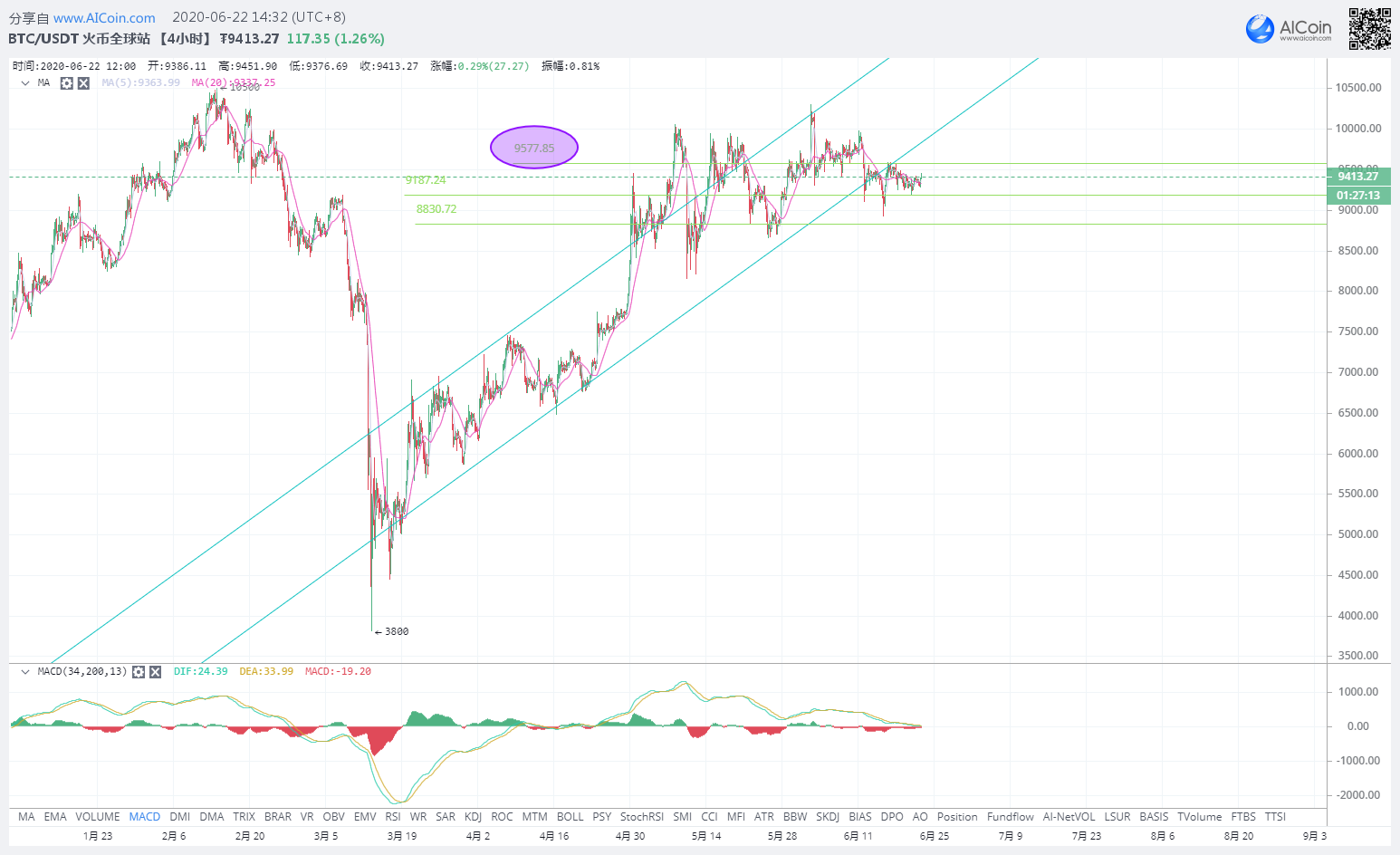 BTC,24H级别指标,在上周20日分析了BTC下行的概率越来越大主要是基于MACD流入和流出资金比越来越低,然后出现了天地针最低9172U,不过又急速反弹上行;日线上仍然受到20日均线的压制9557U,今天有可能会测试下9500U的位置再下来,此时并没有大的交易机会,还是轻仓操作为主,支撑位:9333U/9257U,压力位9557U。