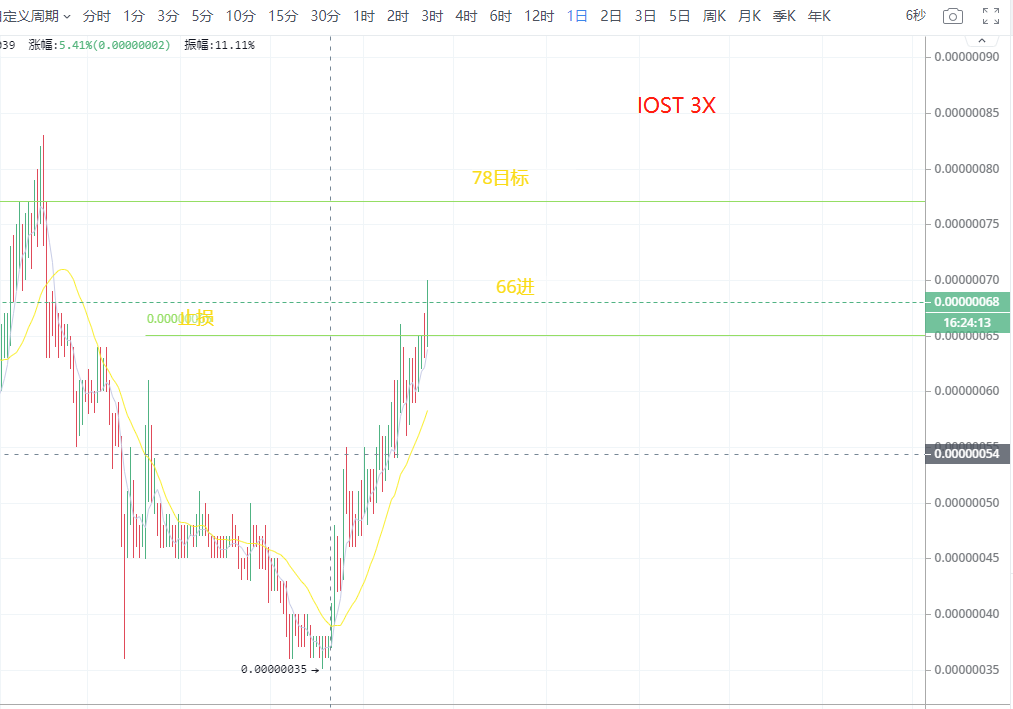 3、IOST/BTC 该交易对有持续走向的趋势,若有兴趣的可以再66进场,77出来,使用3倍杠杆交易策略,止损65。