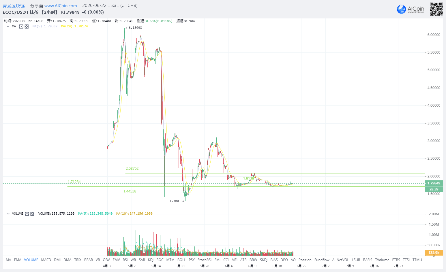 2、ECOC/USDT行情分析,上周的行情主要还是在衡量震荡,上方第一压力位1.81U,若突破了则后市可能会拉升一波,支撑位1.71U/1.44U,压力位1.81U/2.08U。