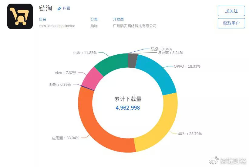 相较于秘乐,链淘低调的多。搜索“链淘”后,跳转出来的只有零星几条消息。据第三方平台数据显示,从2019年11月至今,链淘安卓端的下载量刚过496万。
