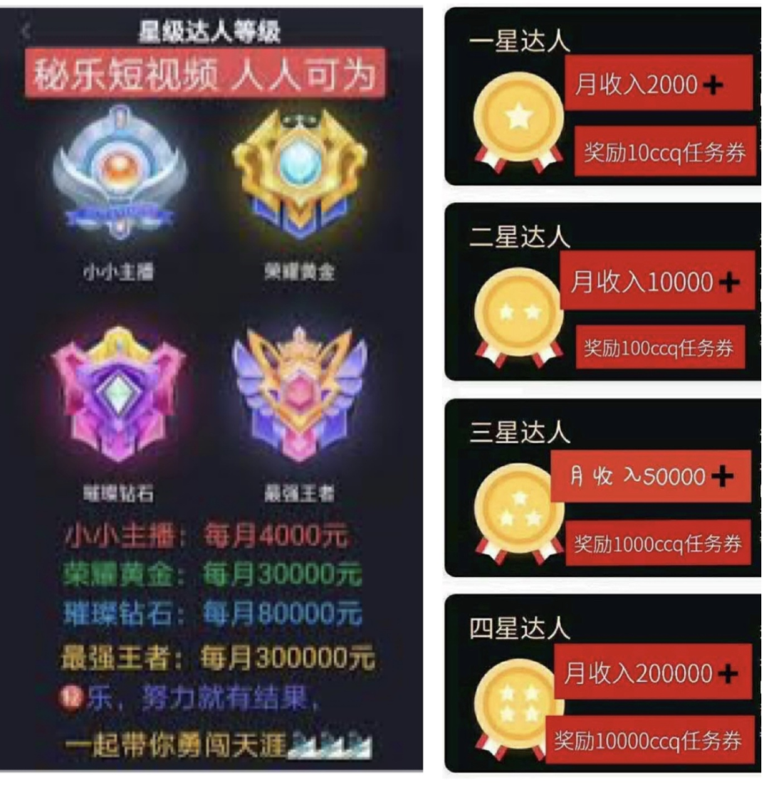 虽然用户可以选择不推荐新用户,只是单纯完成任务获得秘豆或是CCQ,随后卖出获得收益,但是大部分用户赚取收益的主要来源之一就是靠发展下线,且秘乐和链淘鼓励拉人头,形成层级网络,对于发展下线的人员明确表明提供物质奖励和其他经济利益(如全球手续费分红、代币奖励)。