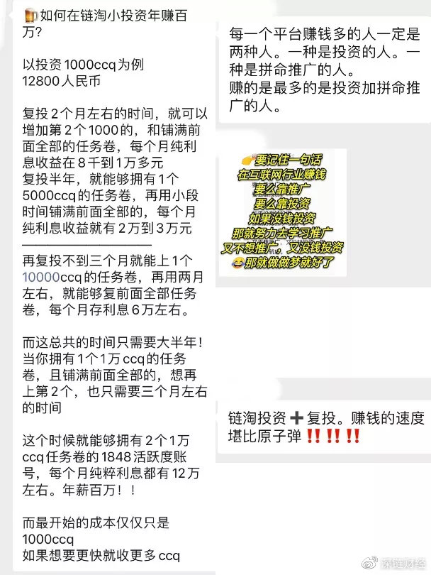 对于初涉盘圈的新玩家们,很多人的知识库还没将新变种的0撸资金盘纳入,再加上每日微信群内打鸡血似的洗脑文案,以及刚在0撸项目上获得的第一桶金,他们更多看到的不是危险,而是想象中的美好未来。