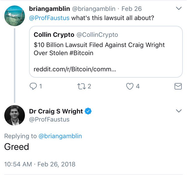 Popular media accounts in Gizmodo and Wired, investigating Mr. Wright’s correspondence, along with interviews he’s done, are cited as evidence to both his character and claims of bitcoin wealth – none of which bodes well for Mr. Wright in this instance. There even appears to be correspondence with the deceased man’s brother, confirming an arrangement to split bitcoin in the hundreds of thousands.