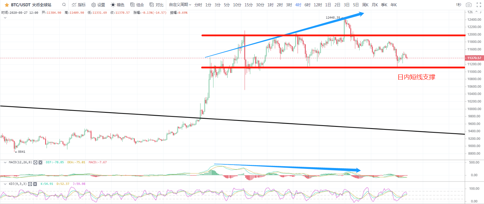 4小时级别的走势来看目前的交易主要集中在11100-12000这个位置,超过12000时常出现大量卖盘使市价逐渐下跌,跌破11100以后市场出现大量的买盘再次使币价震荡上行,理论上我们短期的操作思路就是在11100-12000这个区间进行波段操作。刚才日线顶背离皇叔没在图上标明,大家可以参考下图4小时级别的背离走势,可以明显看到币价在向上走,指标在向下走。这就是很明显的顶背离。从4小时级别看顶背离已经被消化掉,也就是指标目前已经基本正常和币价一致。而且RSI也处于30-35附近的低位,跌破11100就会形成超卖,短线我们还是继续把11000作为防守线,不破逢低做多,跌破可以适当追空。