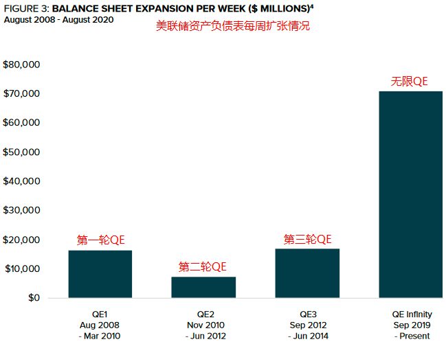 图三所示,如今的美联储正以史无前例,前所未有的速度印钞,这被称为无限QE。尽管相对于其他主权信用货币,美元指数正在走强,但是正在实行的宽松政策,依然导致投资者们对通货膨胀持谨慎态度。