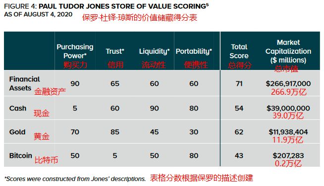 2020年5月,华尔街著名投资人保罗·都铎·琼斯(Paul Tudor Jones)在给投资者的信中提到了他投资比特币的理由。Jones在信中写到,在考虑货币通胀的情况下,他和团队对金融资产、现金、黄金和比特币等金融资产进行了打分,打分的维度分为购买力、可信度、流动性和便携性五个维度。