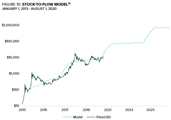 图10显示了一个流行的模型,它利用比特币的价格与库存-流动之间的历史关系来估算未来的价格。虽然价格确实遵循了这种高度相关的库存-流动模型,但这种关系可能是虚假的,因为这并没有考虑到价格升值。