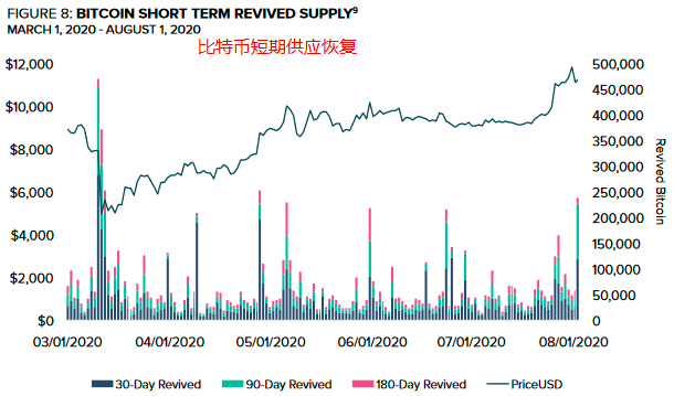 BDD还可以进一步细分为不同的年龄层,在更短的周期内为投资者提供更加具体的交易指标。图8显示了30天、90天和180天比特币的供应量,这些此前休眠的现在“复活”的比特币。2020年3月的情况说明,短期内供应激增表明比特币价格将会大幅上涨。