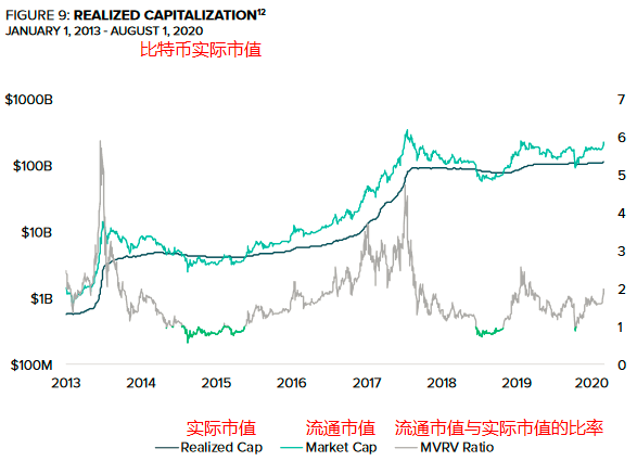 比特币的实际市值,是通过计算每个比特币在最后一次链上移动时的价格计算得到的。例如,在计算比特币实际市值时,2012年转移的比特币对总市值的贡献要小得多,因为当时比特币很便宜。使用这种方法衡量比特币总市值时,分析师就可以忽略掉那些因私钥丢失而永远找不回来的比特币。