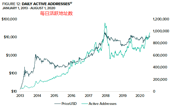 每日活动地址(DAA)是对某天所有参与比特币转账的址数的统计。虽然DAA并不能涵盖所有用户,但它仍然是投资者观察比特币网络增长情况的窗口,总体上DAA与价格呈正相关性。图12表明,当下的DAA指标处于自2017年以来的最高水平。这说明当下的比特币网络接受度较高,也可能预示着一个新的市场周期的开始。