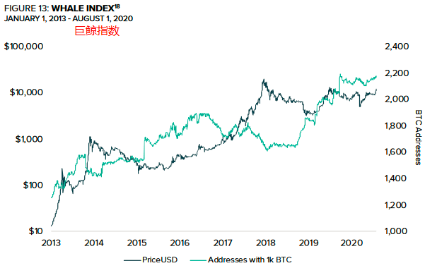 巨鲸指数是指地址中余额超过1000个比特币的数量(截至2020年7月30日,约1100万美元),截止7月30日,该数据正趋近历史新高,如图16所示。