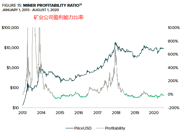 比特币价格与挖矿成本的比率,用于展现比特币在一段时间内的价格下限。这一指标的内在逻辑是,长期底盈利会淘汰中小矿商以改善市场结构。绿色区域代表无利可图的时期,也是最好的买入机会。