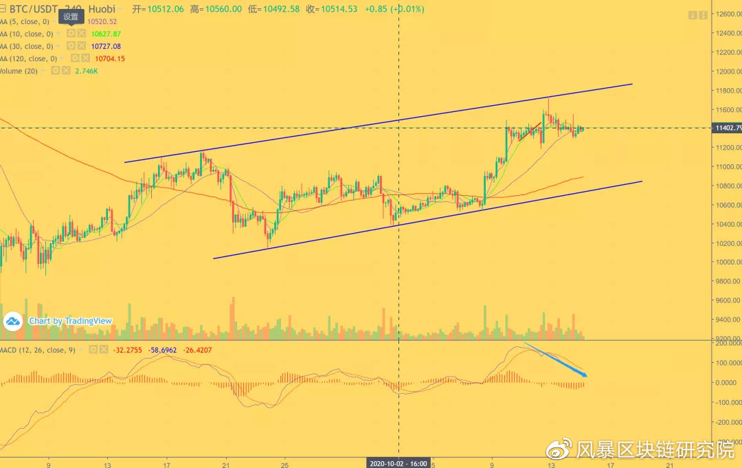 大盘昨天延续了四小时的调整浪,最低打到了11300一线附近支撑,短期下方的支撑依然在11280-11300这个小支撑区间,今天上午行情走了一个小时级别的反弹浪,且小时线macd低位金叉(止跌标志)后震荡上行,小级别延续大级别观点,将一小时反弹这笔代入四小时走势来看,可以看到四小时走势正在冲击布林中轨线11420这个位置的压力,如果四小时突破11420这个中轨压制可能会向上去冲击boll上轨11550这个位置。现货上这个位置依然属于11000上方的高位震荡整理,建议现货继续拿着。跑短单方面昨天不管是文章还是社群带的空单利润很可观,恭喜跟上的朋友。今天日内操作风暴建议还是压力位高空为主,强压在11550这个位置,保护损放在这个位置之上,下方目标看到短期支撑11300这个位置。压力位:11550,支撑位:11280。