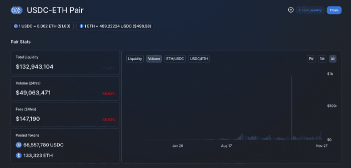 在上图中,我们可以看到,USDC-ETH池的14.7万美金的交易费用是由流动性提供者共享的。也就是说,如果我一共提供了1万美金的流动性,那么我一天就能赚到约11美金的收益(10000/132,000,000*147,000)。而若把这一收益推算成一年的话,我们提供流动性的收益率就能达到40%左右。