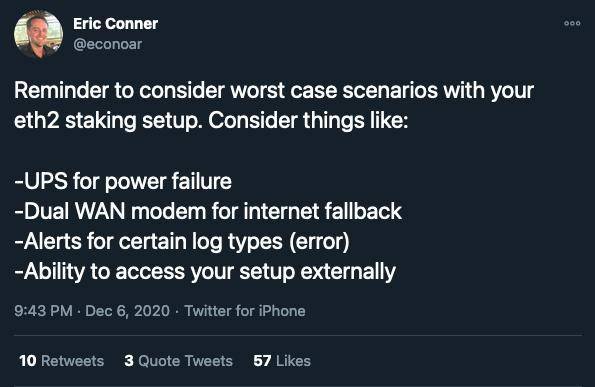 最后,如果你的节点真的发生了什么意外,别要惊慌!即使是遭到怠工惩罚 ( inactivity leaks),在短时间内惩罚数额也不大。冷静下来思考一下发生了什么,为什么会发生,然后制定计划来解决问题。在上手之前深呼吸一下!比起慌忙做出错误决定导致被罚没,给自己多五分钟的思考时间更为可取。