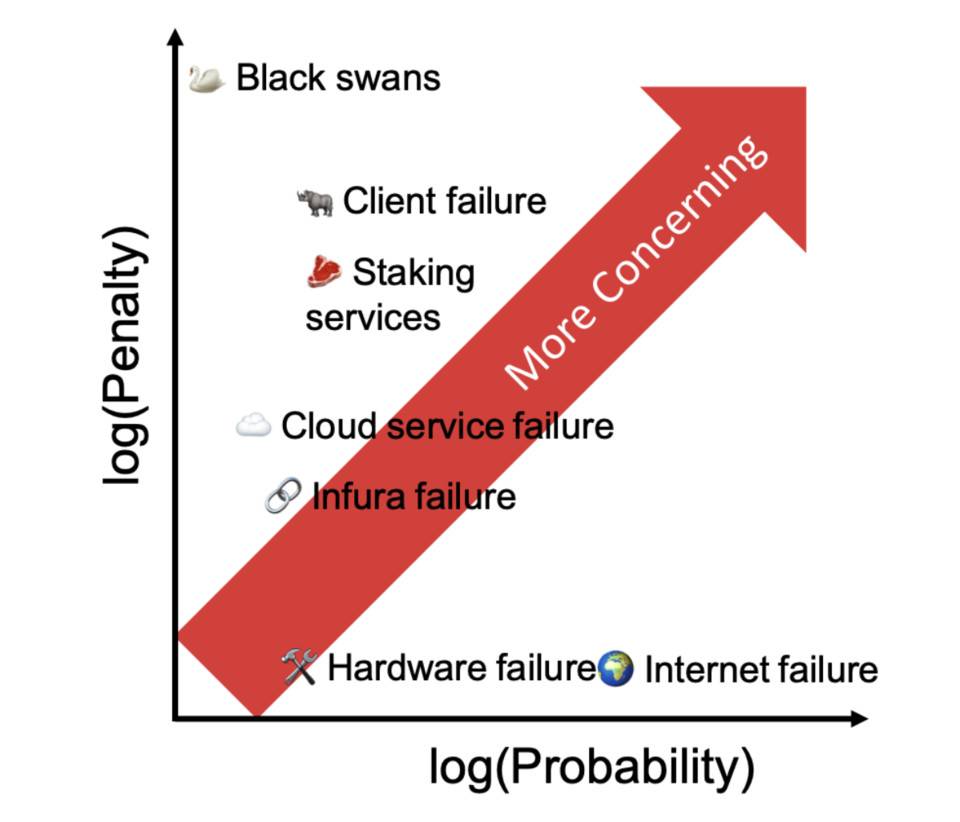 没有人知道节点可能发生故障的所有情形,也不知道每种故障发生的可能性,但是通过对每种故障类型的可能性进行独立估算并稀释最大风险,「群体智慧」将发挥作用。此外,由于每个验证者面临的风险不同,并且对这些风险的评估也不同,你没有考虑到的风险可能会被他人碰到,因此相关性将降低。去中心化的力量!