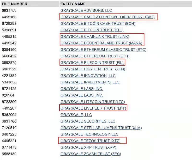 据美国特拉华州公司备案网站上显示,灰度已经组建了新的信托公司,除了最早被曝光的灰度 Chainlink(LINK) 信托外,还有 5 个币种,分别是 XTZ、MANA、FIL、LPT、BAT。
