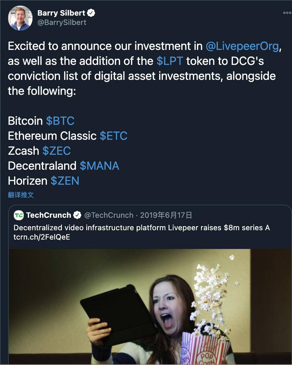 2019 年 Barry Silbert 就在推特高调宣布,DCG 投资了 Livepeer。
