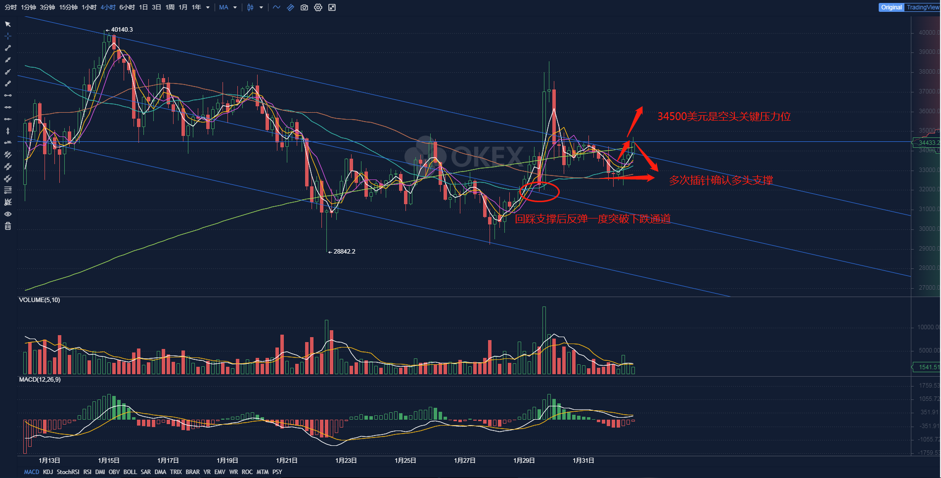 BTC:大佬集体喊单,机构还在入场,币价来回插针,新一轮的机构是否会来接盘此时的BTC呢,这无从所知,午间BTC再次触及34500美元一带的颈线压力,随后插针回踩,从小时线上来看,MACD上探零轴,多头在32500美元一带的支撑被喊单加持,一旦突破站稳34500美元上方,反弹力度将会加大,如未能站稳,我觉得短线将是很好的减仓机会,等待市场缓冲过后再看。