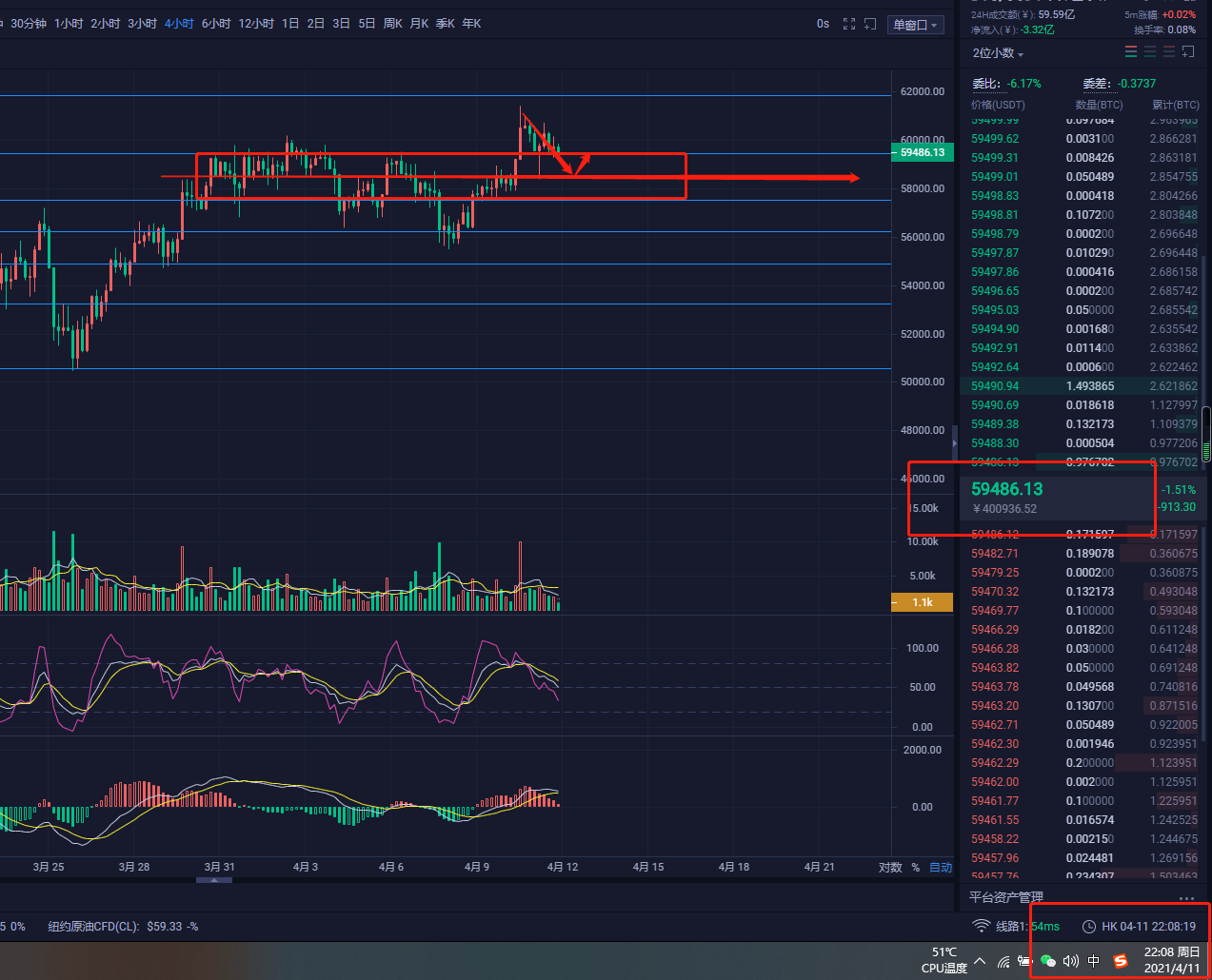 虽然忙着教别人做几天没有更新自己的看法,但是我依旧都在关注,由图可见上周三的斐波那契回调直线依旧有效,上方压力无法突破,所以回到区间内震荡的可能依旧存在,接下来现在的市场价(59480)可以看一波空头,下方可看(58500),上方压力注意(59750)