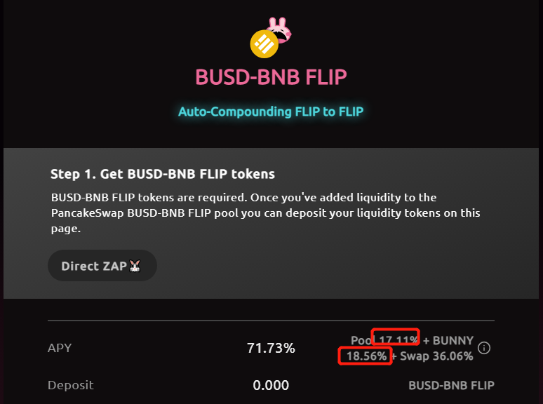 当前,1BNB的价值是680U,1bunny的价值是340U。则用户实际的APY是:[24.58%*70%]+[24.58%*30%/680*5*340]=17.14%+18.64%