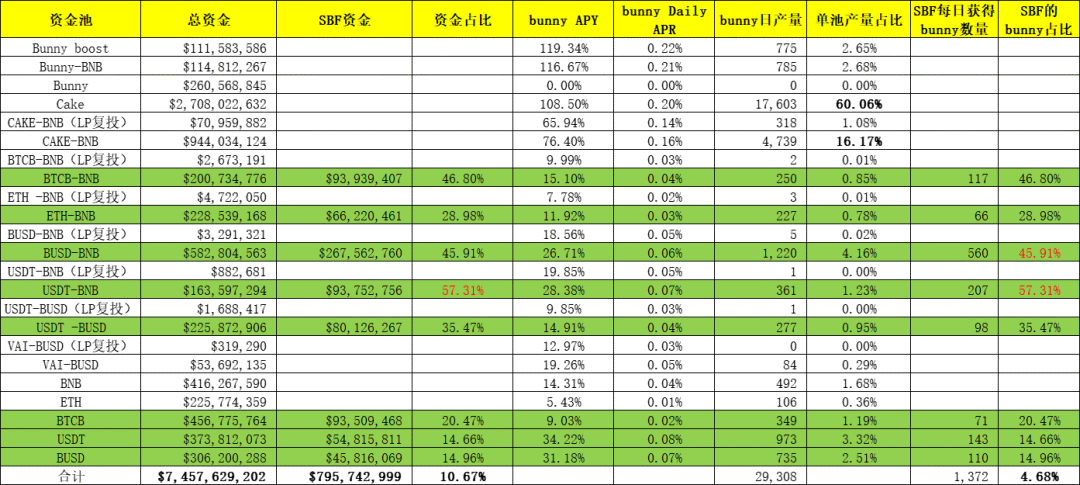 当前,pancakeBunny上共有23个资金池。其中SBF参与了8个。在SBF参与的这8个资金池,锁仓资金大约有25亿美元。其中SBF贡献了7.9亿美元,占比31.34%。
