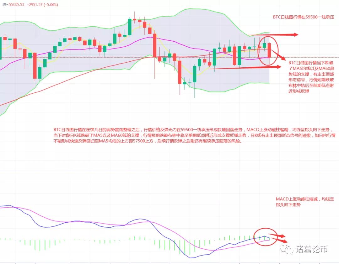 2、BTC行情日线图有即将走出顶部形态的信号,如行情向上反弹不能快速的回归至MA5均线的上方,则行情反弹之后还有继续承压向下大幅回落的风险,所以如BTC行情反弹至57000-57500区间附近有承压迹象可介入空单,止损57500上方,目标看至56000-55000区间附近。(文章审核有延迟,策略不可重复使用)