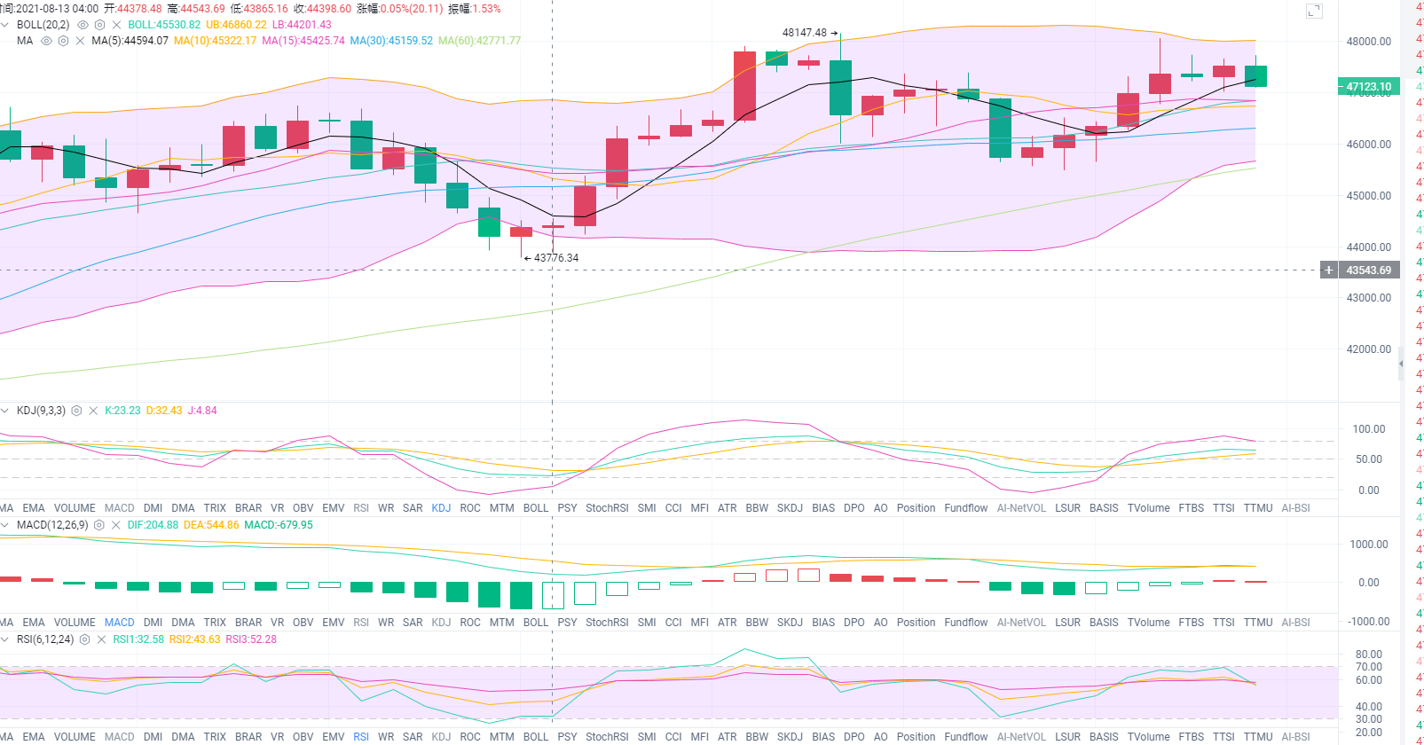 比特币今天整体呈高位震荡盘整走势,最高点再次触及到48000美元上方,日K方面再次收回至5日线上方,MACD指标绿色能量柱在零轴上方逐渐收敛,其它指标也没有明显的涨跌行情,多空双方对决依然焦灼。小级别4小时来看MACD上穿零轴,KDJ指标在低位金叉开口上行,布林带指标强势运行在上轨区间,RSI指标值在66附近的强势区间走平,预计接下来比特币走势仍将以高位震荡盘整为主。下方依然关注10日线支撑力度,