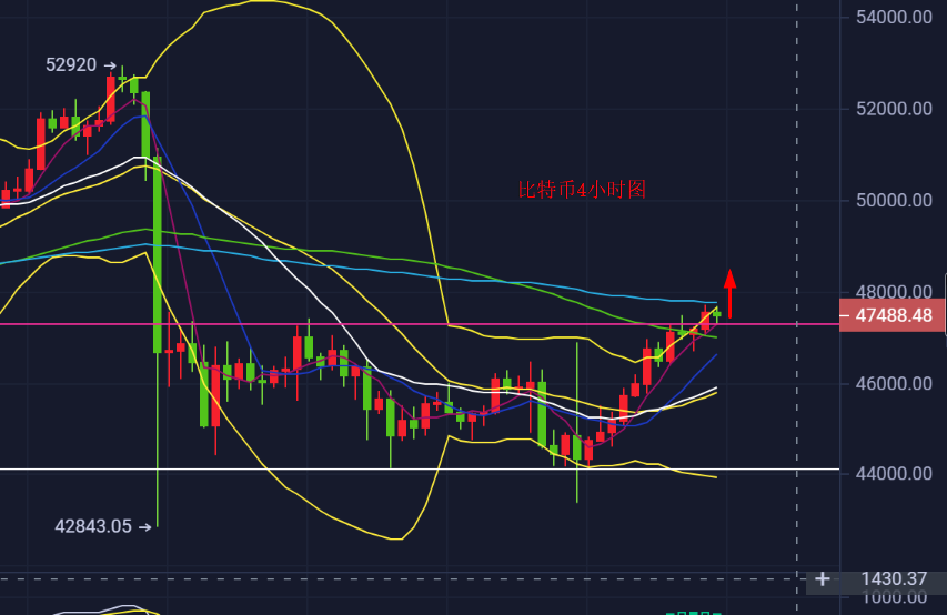 昨天,比特币强势冲高,多头还是比较强势,从之前的下探反抽之后,依旧没有改变大的方向!而今天47500的失守已经奠定了上涨的基础,目前虽然有所调整回落,但比特币的短线来看多头还是相对乐观。比特币昨日一根大阳K线吞没了此前的跌幅,并且突破了前期的高点47500-47600的关键压力位,预计晚间还会继续冲高!