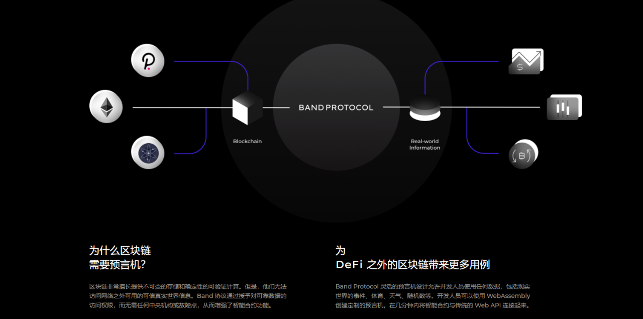 简单的来说Band Protocol是一个用于Web3.0应用程序的去中心化预言机框架,可以帮助智能合约与可信的链下数据连接。项目的愿景是成为一个去中心化的世界数据库,任何去中心化应用都可以依赖这些数据库来获取可信数据。