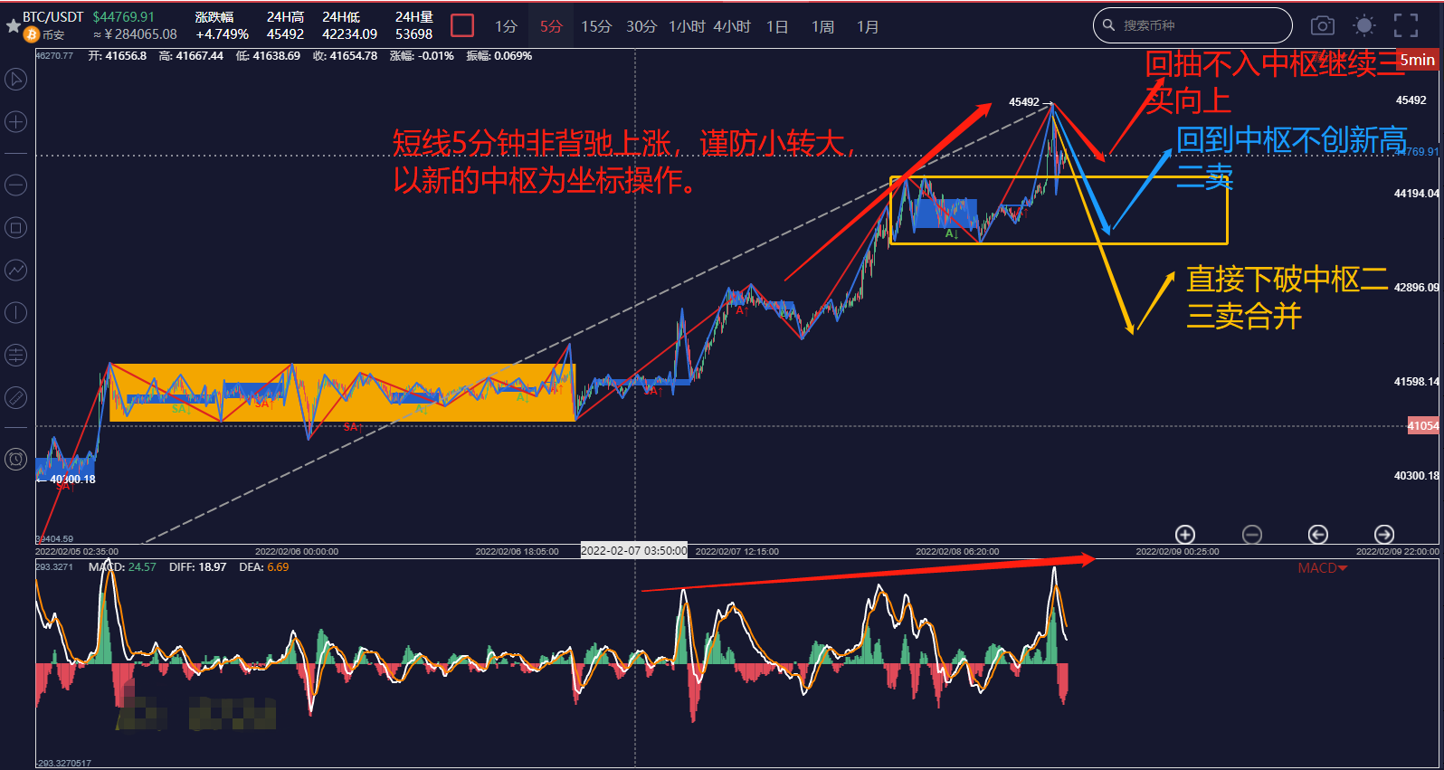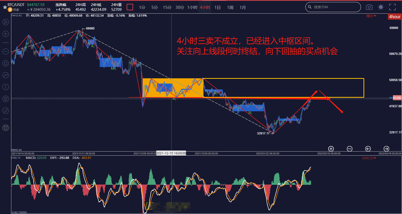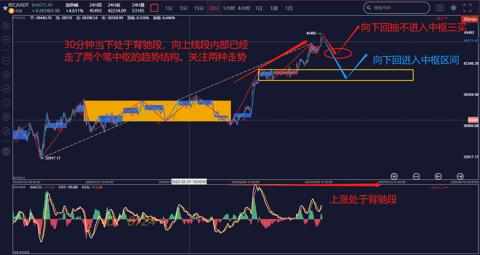 BTC走势比预想中强,今天下午已经向上突破4小中枢下沿45462,三卖不成立!但是三卖不成立不意味着行情就一直上涨,当下30分钟级别仍然处于背驰段。直接上图: