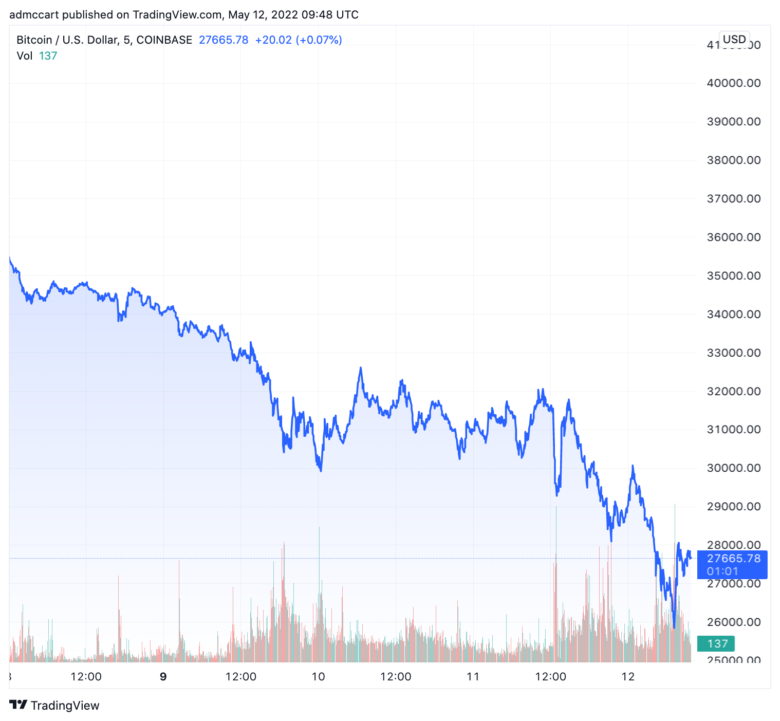 As of Thursday morning, bitcoin was trading at $27,665 dollars, down from $32,056 just 24 hours previously, according to Coinbase data via TradingView. Thursday’s losses mean that bitcoin is down just over 30% in the past week from $39,486 on May 5.
