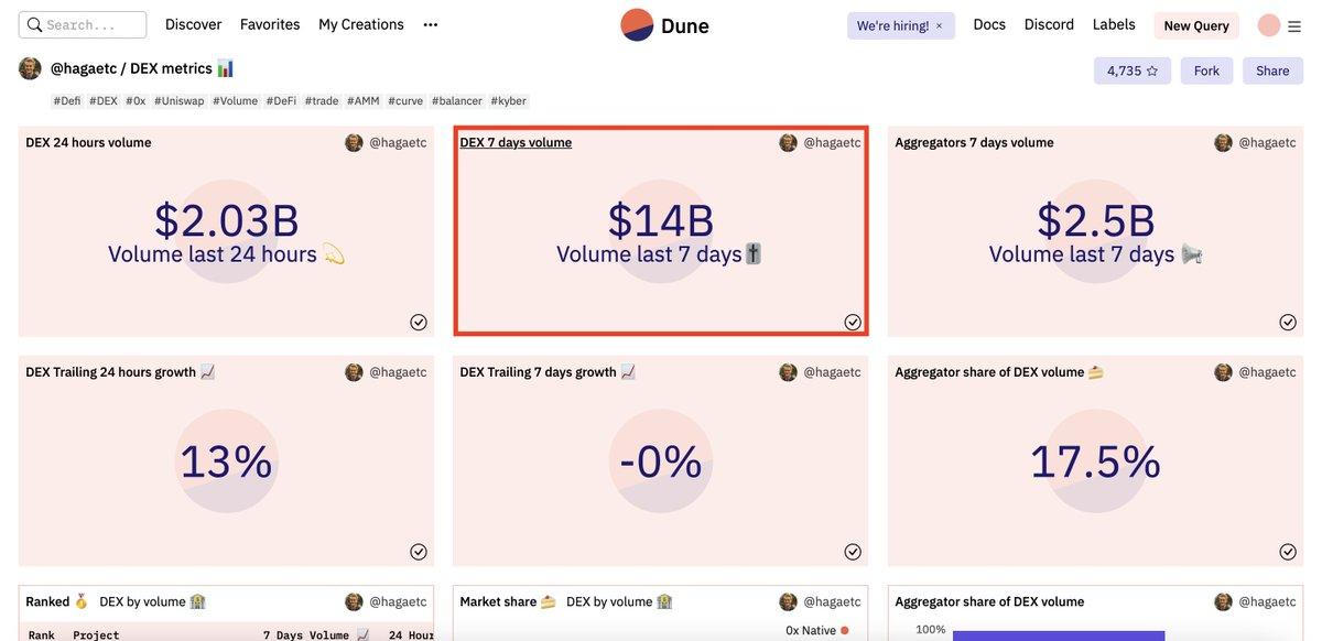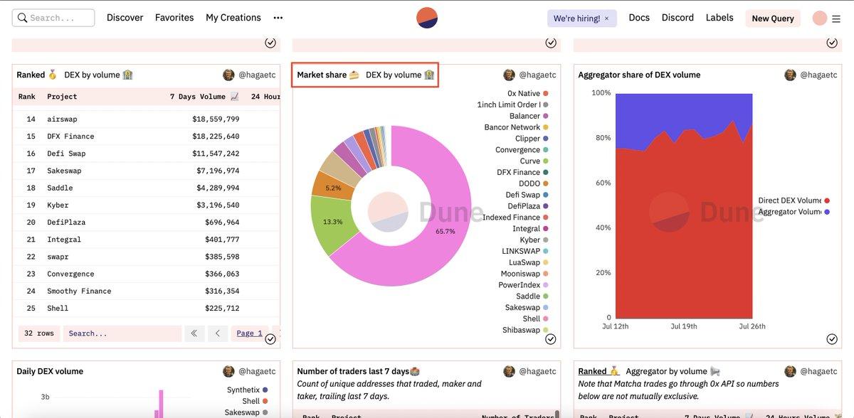 让我们看一下由用户@hagaetc创建的DEX指标控制面板。我们可以看到一些关于DEX的有用统计信息。还有一些与DEX数量和市场份额相关的图表和可视化效果。