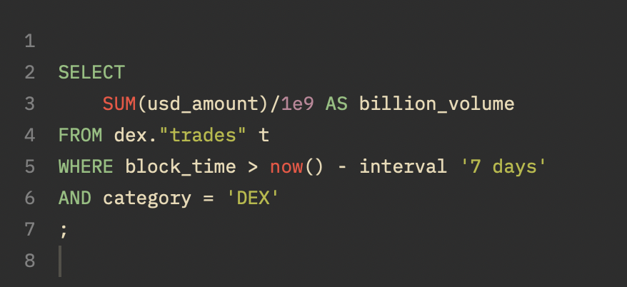 概括地说,这个查询正在查看上周所有DEX以美元计价的交易量。