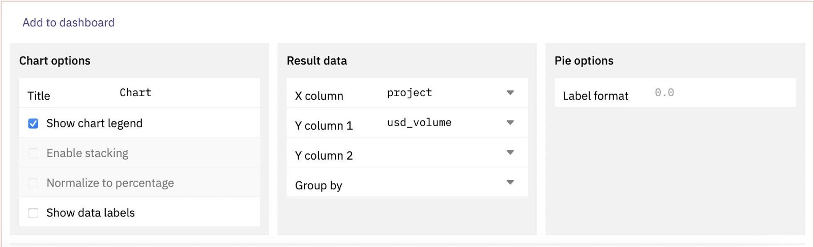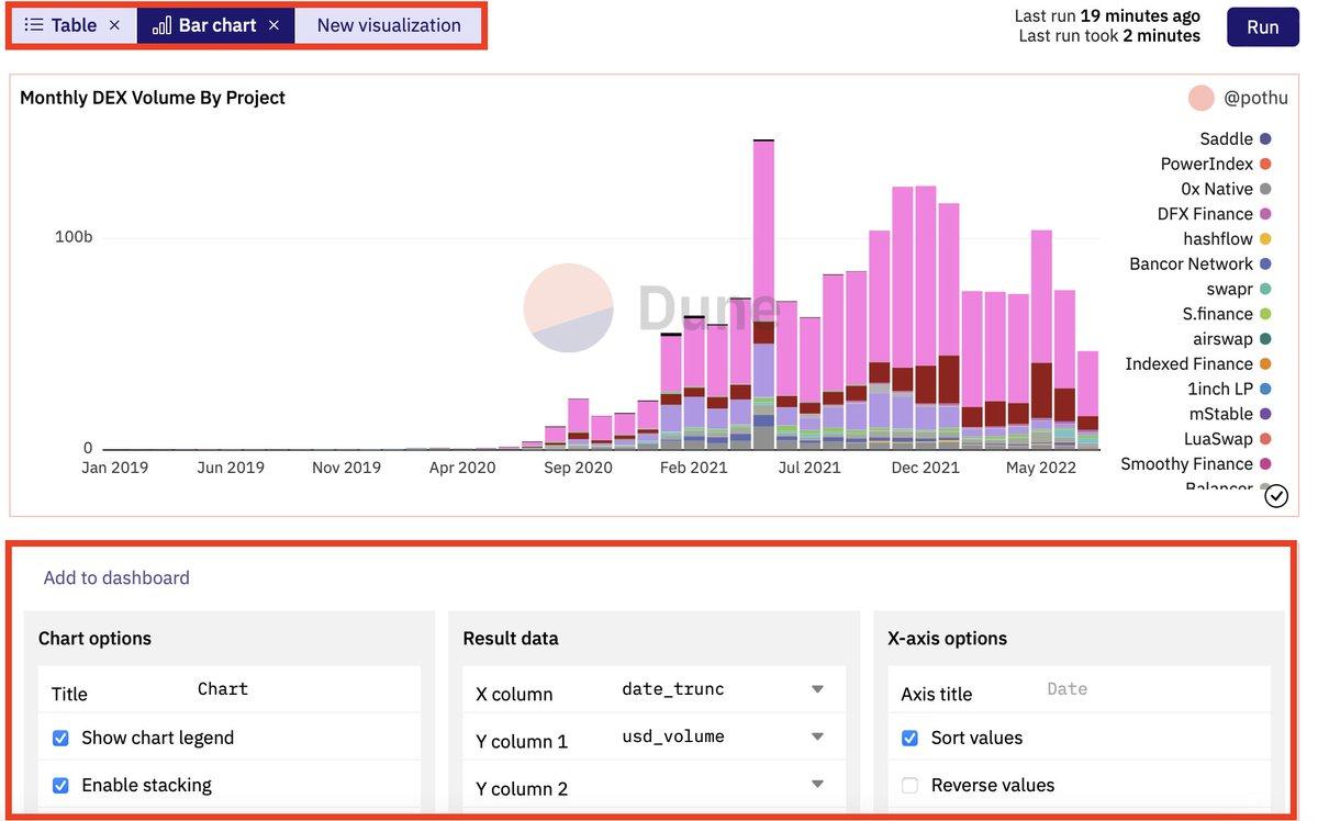 对于给定的查询,你可以创建可视化效果或编辑现有的可视化效果。让我们看一下按项目划分的每月DEX交易量查询。