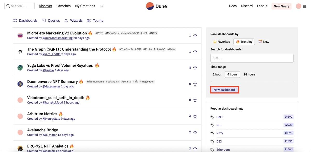 要开始创建,请前往Dune官网主页,然后单击“新建仪表板” :