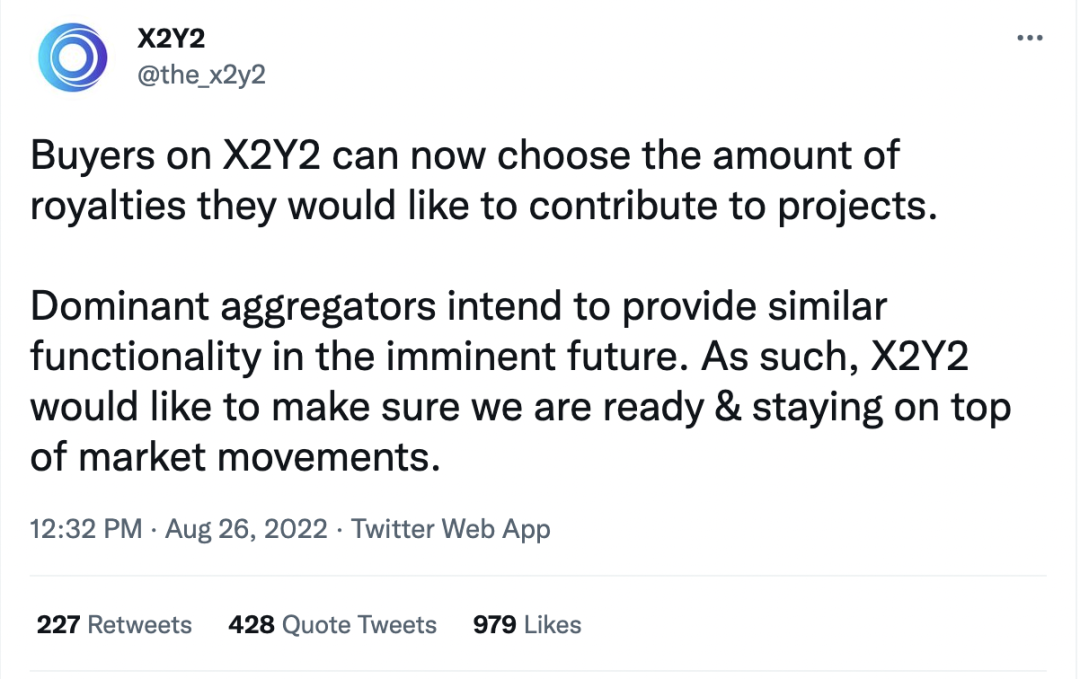 这一招,直接动了诸多NFT项目方和艺术创作者的蛋糕。试问,作为一个尚未实现财富自由的经济理性人,不选0版税不是傻吗?因此,取消版税事件在外网上闹得沸沸扬扬,诸多NFT项目方和数字艺术家群起攻之,认为在现阶段实行“0版税”制度根本不存在可行性,不仅达不到将NFT数藏拉出熊市的目的,反而直接砸掉了一众勤劳作家的饭碗,让大家本就不富裕的日子雪上加霜。随着舆论发酵,X2**平台不得不在两天后宣称:“0版税绝不是NFT的未来。”紧接着,该平台陆续出台了一系列0版税“平替”政策,试图拉升熊市下的NFT市场流动性。