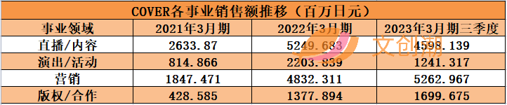 在COVER的各项业务中,收入占比最大的是直播/内容(下文有业务模式的具体阐释),上一财年(2022年3月期)为52.5亿日元(四舍五入),同比大幅增长99.31%。