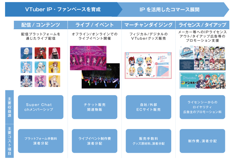 前两部分业务,以孵化VTuber IP及粉丝增长为主;后两部分事业在前者基础上,利用IP展开商务活动。