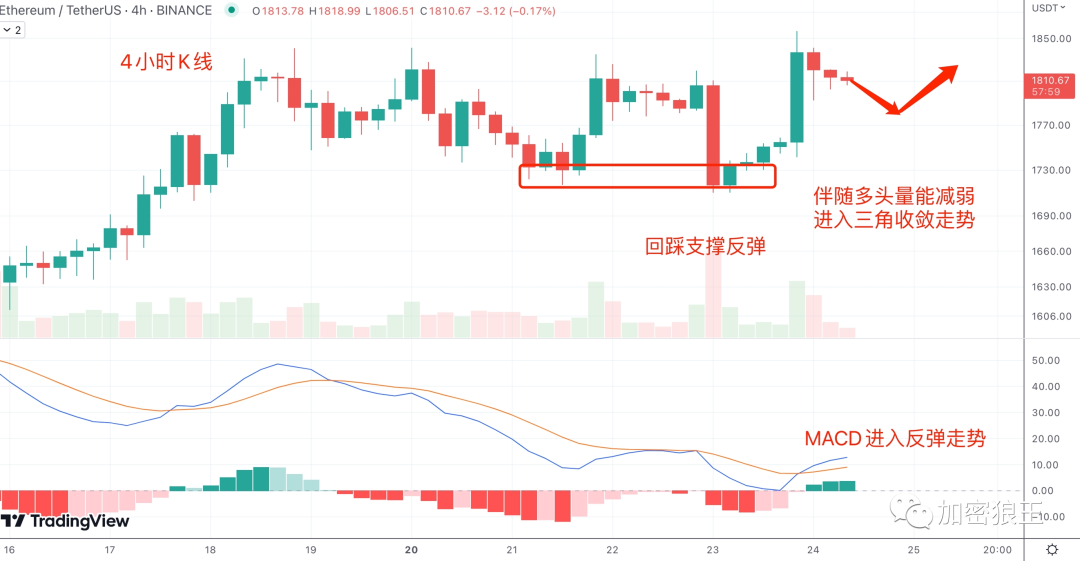 ETH在5日线插针反弹,确认底部支撑,小时线做U型反弹,底部不断抬高,伴随多头量能减弱,ETH进入三角收敛走势,等待修复跌幅,下方1787.3美元是三角支撑关键点,接下来ETH在1787.3美元插针反弹。