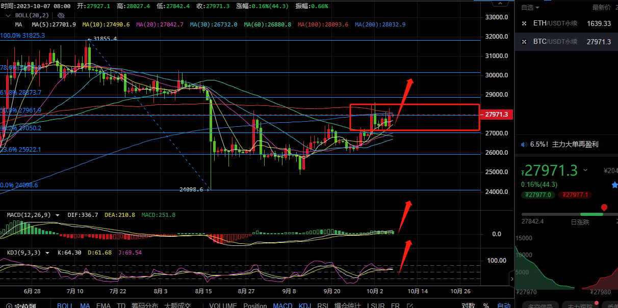 大饼的行情直接也是拉升上涨了上来,最高到了28333的位置,行情下方支撑坚定看涨,上方的压力目标在28000的位置,也是顺利上涨了上来,下方的支撑坚定看涨也是没有任何的问题的,跟上布局的朋友也是顺利走出了1000个点,把握好行情就行,而现在的行情,晚间也是在上方日线均线MA100的位置短线有一定的压力承压,而既然目前行情突破拉升,上方的压力没有有效的突破上去,那么短线肯定是会有一轮回撤下跌的,或者说行情短线震荡以后,再来继续拉升,因为目前日线的附图指标也是在高位来回走,短线继续突破还是有难度,需要进行震荡筑底以后,才能打开后续的行情趋势,所以说目前对于周末的走势,也是要回撤或者震荡支撑上移后,再来反弹,下方的支撑在27300附近的位置,短线先看回撤下方支撑,支撑可以守住,再来走后续的行情!