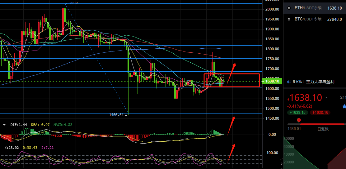 以太的行情整体上涨并没有走出太大的区间,整体上涨也是到了目标下方1663的位置,就开始了回撤,上方的压力目标1670还差一步之遥就进入了回撤,因为日线的走势上方MA60还在逐步的进行下移,上方直接拉升到压力就回撤了下来,因为明天周日,周线进入末期,行情要想继续进行突破,还是要经过短线的来回震荡筑底以后,才能继续拉升上涨,而下方的支撑日内在1610-1620的位置,短线行情依旧是先等支撑,短线下跌到了支撑之后,再来考虑反弹上涨,或者说就在目前行情震荡区间来回修正吸筹,等待支撑上移再来继续上涨