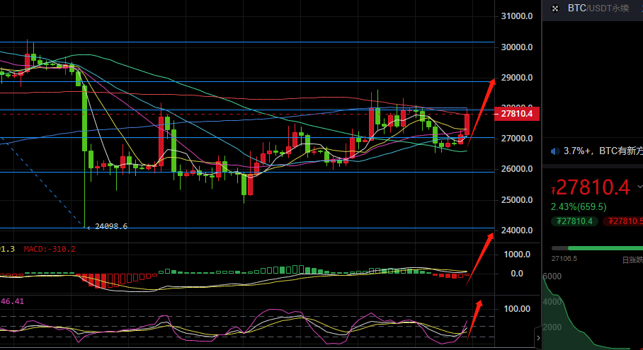日内也是直接上涨,上午的行情布局中也是讲过了,下方的支撑依旧是比较明显,对于日内的走势来说,可以直接看涨没有问题,比特币也是最高到了27990的位置,日内下方支撑看涨目标压力27800也是直接止盈,大家把握好行情就行,目前的在经过了日内的上涨拉升以后,现在的短线也是在下方的支撑来回进行逐步的震荡盘整,因为目前的四小时走势中,下方MA5的支撑还没有有效的上移,行情均线还是需要上移支撑以后,才能继续打开后续的行情区间,所以说对于日内的走势,还是要继续经过震荡以后,才能继续上看,或者说回撤支撑再来考虑反弹,晚间下方的支撑在27500附近,短线也是会有回落下跌,下跌到了支撑以后可以继续看上涨的力度,上方的压力位在28000附近,压力突破再来继续上看就可以了!