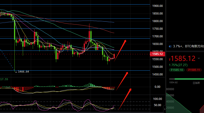 而以太坊的行情也是一样,如期拉升上涨,上方最高也是到了1589的位置,短线下方支撑看涨等待后续突破也是没有任何的问题,短线目前的行情也是在下方MA5的支撑继续向上进行突破,所以说对于晚间的行情,也是可以继续看涨,因为前期行情回踩下方已经是到了支撑了,对于后续的行情可以开始看涨了,后续行情晚间压力依旧是在1600附近的位置,上方的压力站上,那么接下来继续看涨就行!