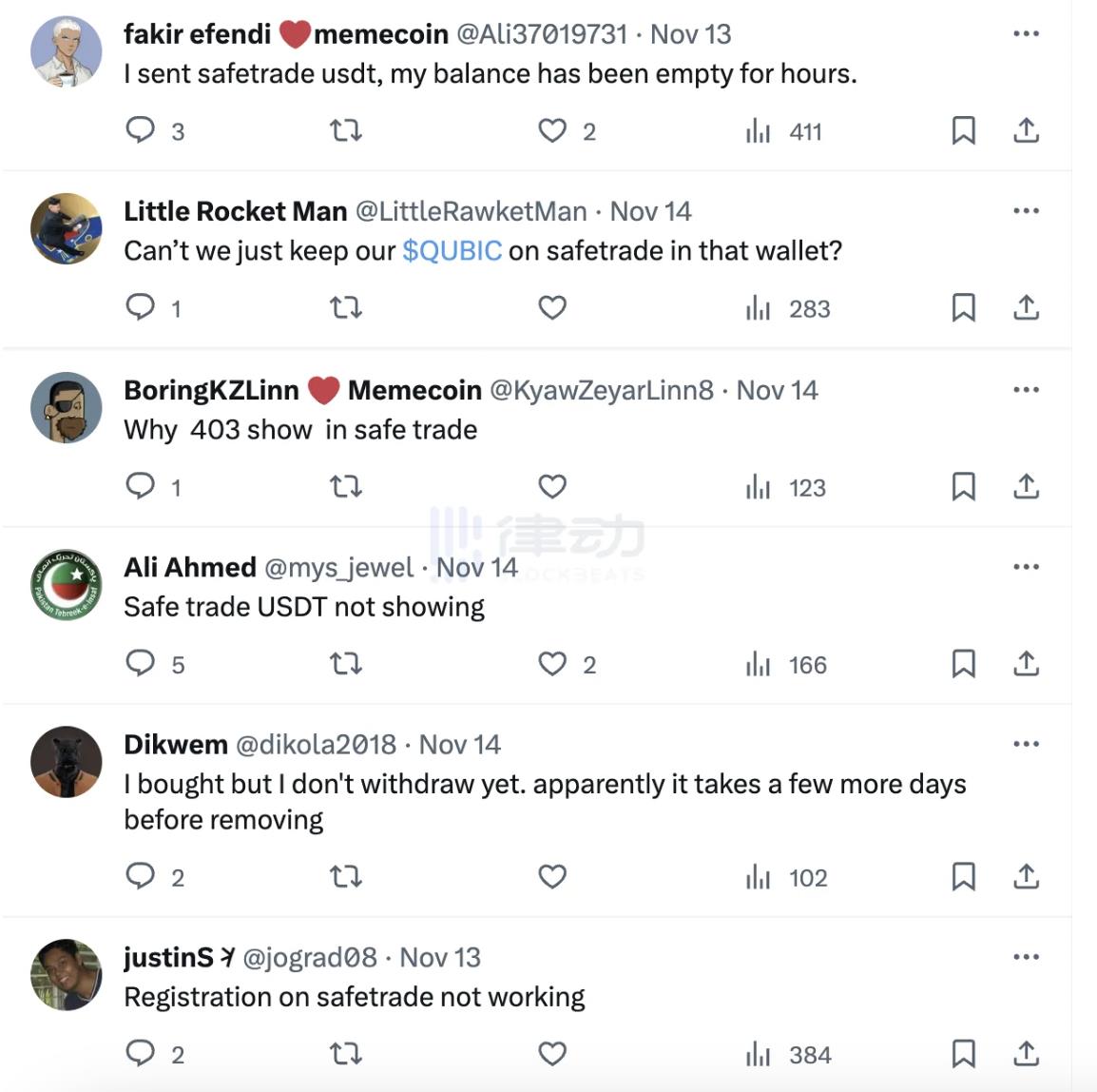 11 月 12 日,由于购买 QUBIC 的人数过多,服务器暂无法处理,SafeTrade 关闭了交易通道。次日 Qubic 官方发文介绍如何购买 QUBIC 时,大量用户在评论区表示自己转入平台的资金无法到账。当日,QUBIC 价格从最高点下跌至 0.0000023 美元,跌幅达 69%。在 SafeTrade 恢复出入通道后,代币价格再次拉升。