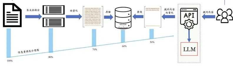“大模型+向量数据库”的运作过程是这样的:先把长文档进行拆分,各个片段进行向量化,作为储备知识存储在向量数据库中;当用户发生提问,提问内容又会二次向量化,在向量数据库中进行相似性检索,找到答案后,再由大模型输出文本。这过程中存在最大的难点就是,如何减少信息的损耗,以及提升召回率。