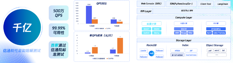 在企业级能力方面,自7月份正式发布以来,腾讯云向量数据库经过多次迭代升级,最高支持千亿级向量规模和500万QPS峰值能力,可用性达99.99%,相同内存可以存储5-10倍的数据。