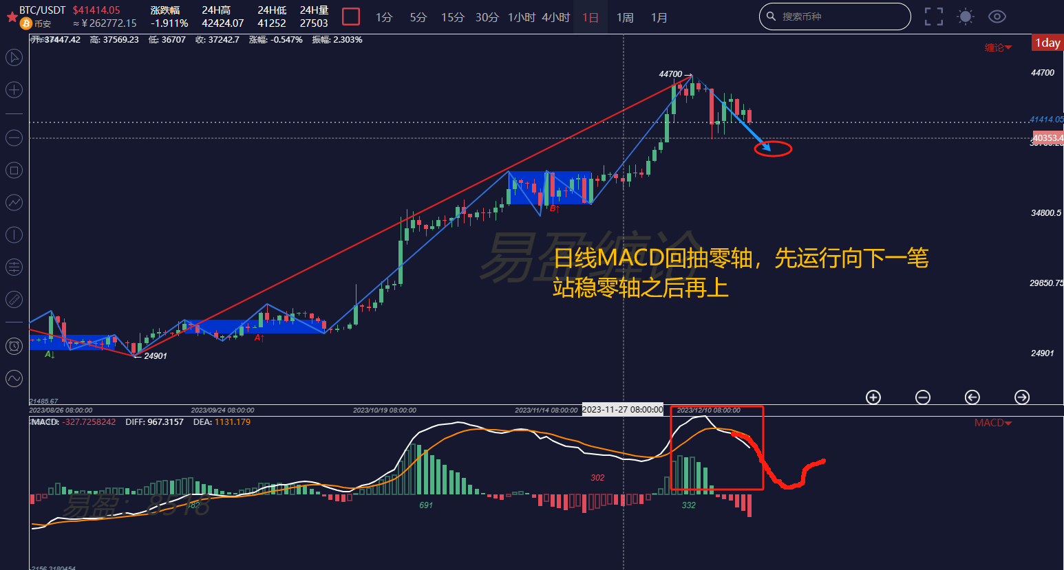 先看日线图,图中可以看出MACD黄白线正处于回抽零轴的过程,红柱子正不断加长。无论如何最少会向下回调一笔,之后观察能否站稳零轴。如果站稳零轴还会再次向上尝试突破。对应次级别就是是否会出笔三买之后再创新高完成日线向上一段。