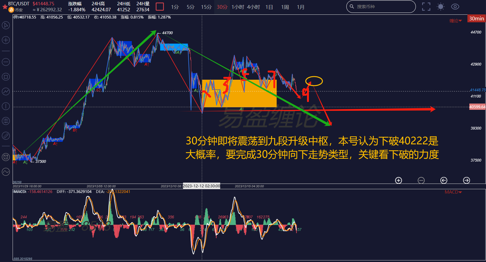 再看4小时对应的次级别30分钟走势图,图中这一个中枢已经震荡到了第八段向下,这一段向下终结再反弹一段将构成九段升级中枢,下破40222低点概率最大,去完成4小时向下一段对应30分钟向下走势类型。关键看下破的力度。
